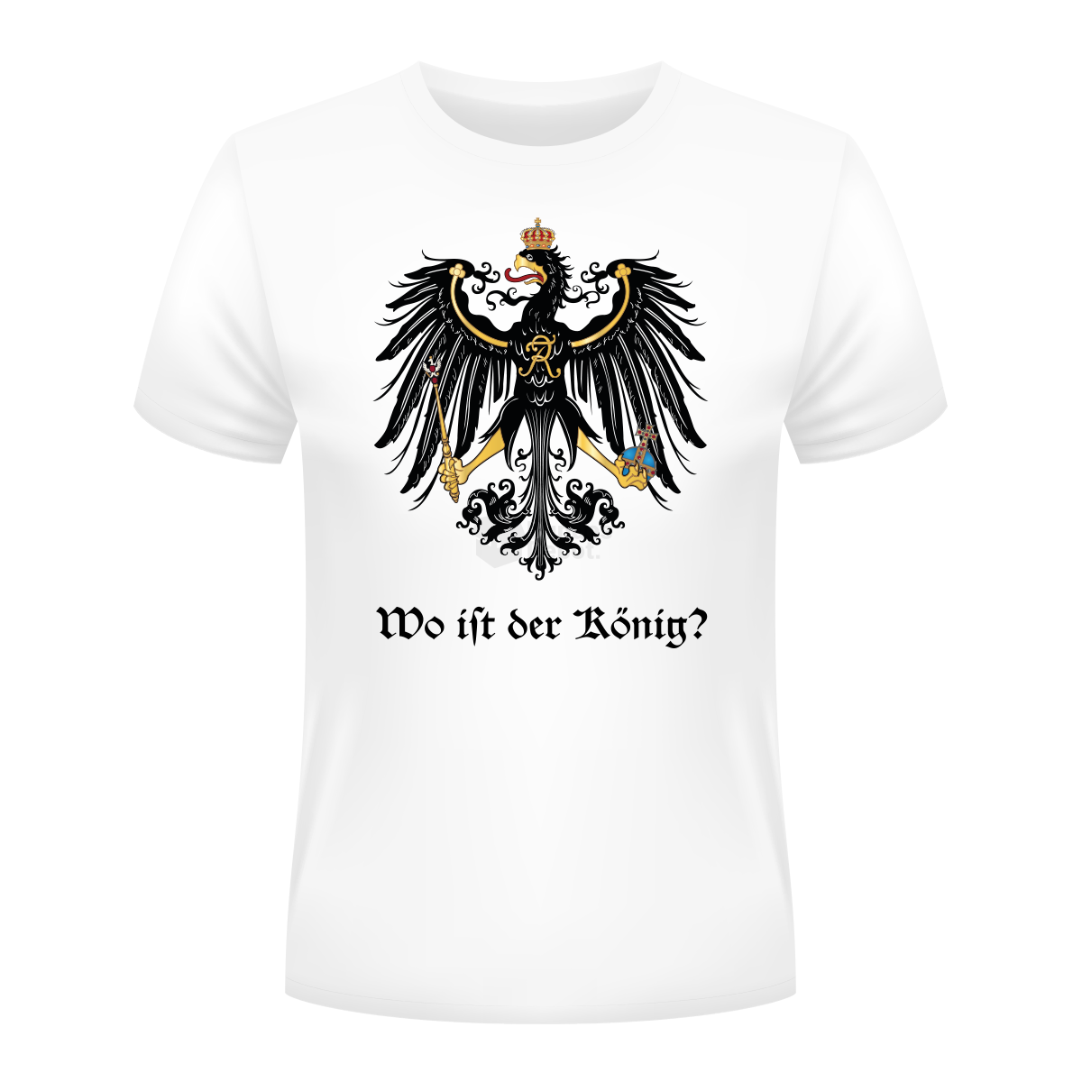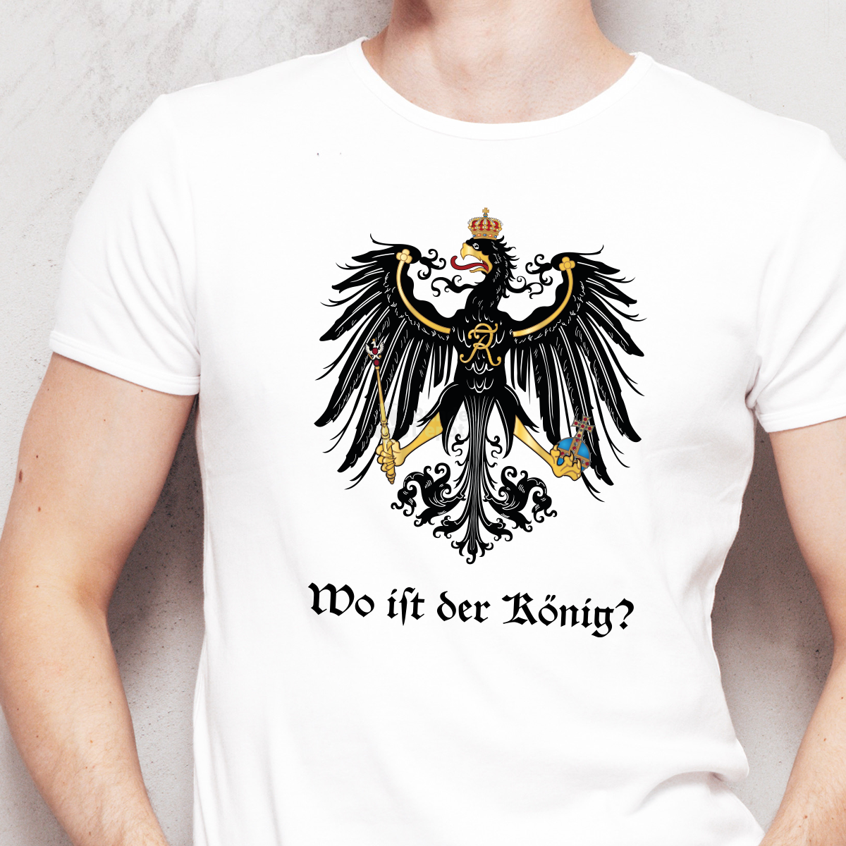 Das T-Hemd „Preußen“ besteht aus 100 % Polyester in Baumwolle-Optik und präsentiert den preußischen Adler. Sowohl der Adler mit der Aufschrift „Wo ist der König?“ auf der Vorderseite als auch „Wir sind Dein Volk.“ sind im Sublimationsdruck aufgebracht und zeigen ein starkes Bekenntnis. Das Polyester ist ein atmunngaktives, schnelltrocknendes Material und bleibt auch nach vielen Wäschen elastisch.